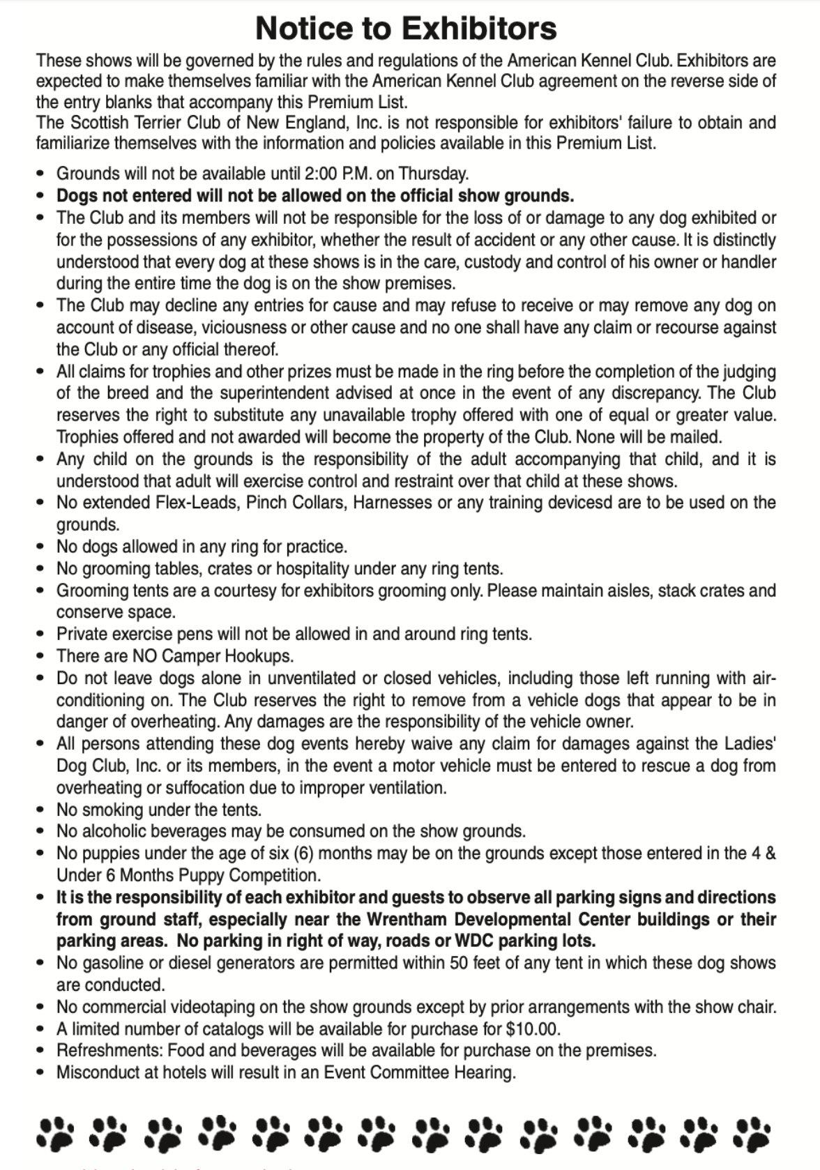The Senior Scotties Parade: - Another non-competitive class Open to ALL Scotties of a certain age! (7 years and beyond) During the parade, we will announce your dog like a celebrity, if you send us a brief introduction, maybe 60 words. An example:"This is Ruth! She's seven years old and is the mother of a total of eight puppies including 2  Champions, one of which was Best In Specialty at STCNE's Specialty in 2022! " To be in this parade, YOU MUST SIGN UP before 12 noon on May28, 2026 using this form.  Every dog must be accompanied by a Rabies tag or certificate, and be firmly secured by its owner with a leash no longer than 6 feet. Dogs will go in the front of the parade, bitches will go behind, and all will keep about 6 feet of distance from the person ahead of them.