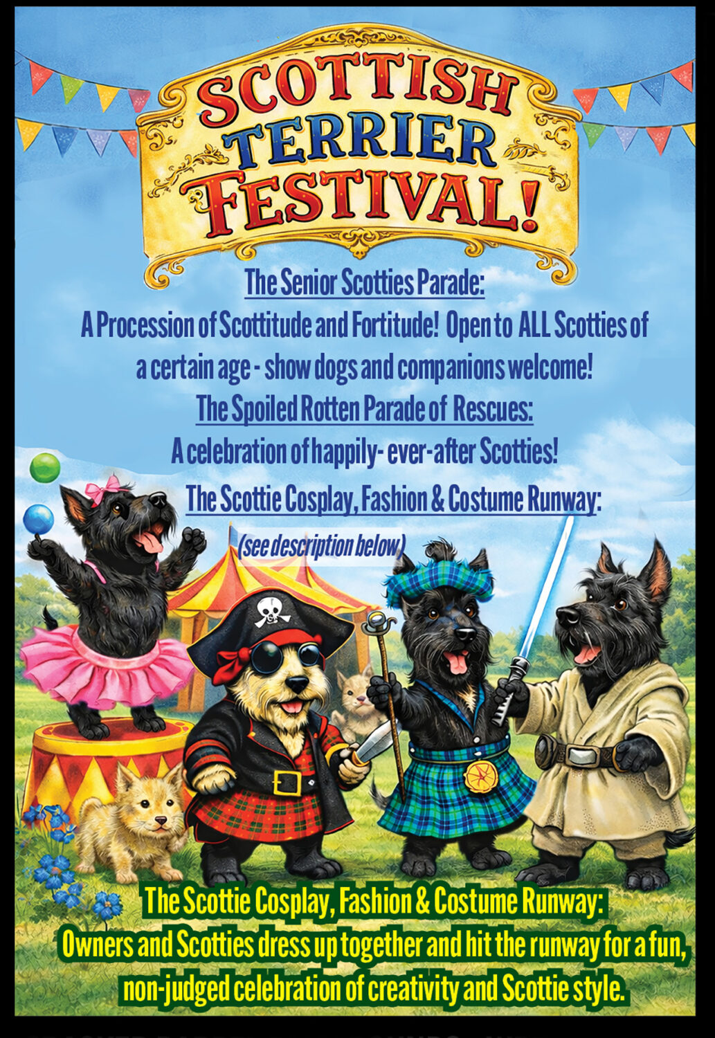 Owners and Scotties dress up together and hit the runway for a fun, non-judged celebration of creativity and Scottie style. Photo sessions will be available after. To be in this parade, YOU MUST SIGN UP before 12 noon on May28, 2026 using this form.  Every dog must be accompanied by a Rabies tag or certificate, and be firmly secured by its owner with a leash no longer than 6 feet. Dogs will go in the front of the parade, bitches will go behind, and all will keep about 6 feet of distance from the person ahead of them.
